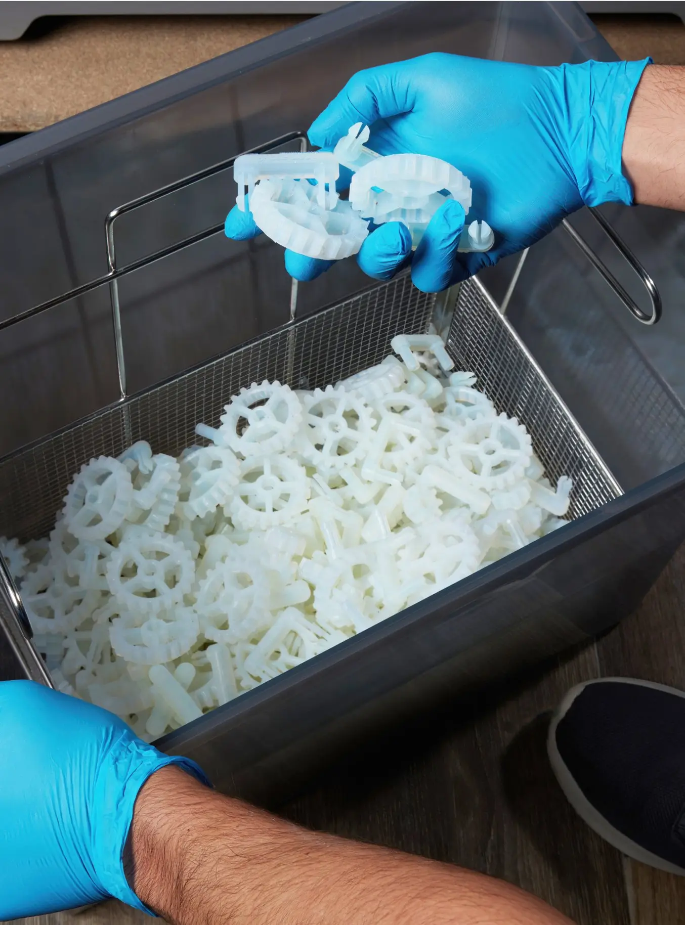 A peça é lavada, curada e estabilizada para atingir suas propriedades finais.